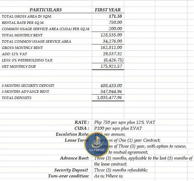Advance Payment : 3 mos depo and 3 mos advance ( will be applicable to the last 3 months of lease term )