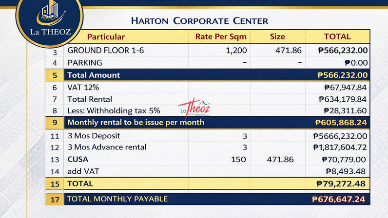 A rare 471 SQM ground floor unit inside a multi-level corporate building with office tenants up to the 12th floor — meaning built-in foot traffic, captive market, and long-term business ecosystem.